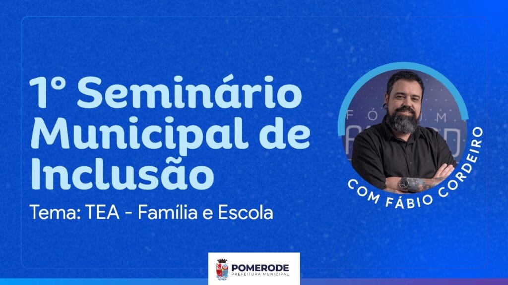 A Prefeitura de Pomerode realiza o 1º Seminário Municipal de Inclusão no dia 28 de abril, às 19h, com transmissão ao vivo pelo canal oficial da Prefeitura de Pomerode no YouTube. O seminário, que tem como tema “TEA – Família e Escola”, visa promover o diálogo sobre o Transtorno do Espectro Autista (TEA) e suas implicações na convivência familiar e escolar, além de apresentar estratégias de acolhimento e o fluxo de atendimento aos alunos com laudo na rede municipal de ensino.