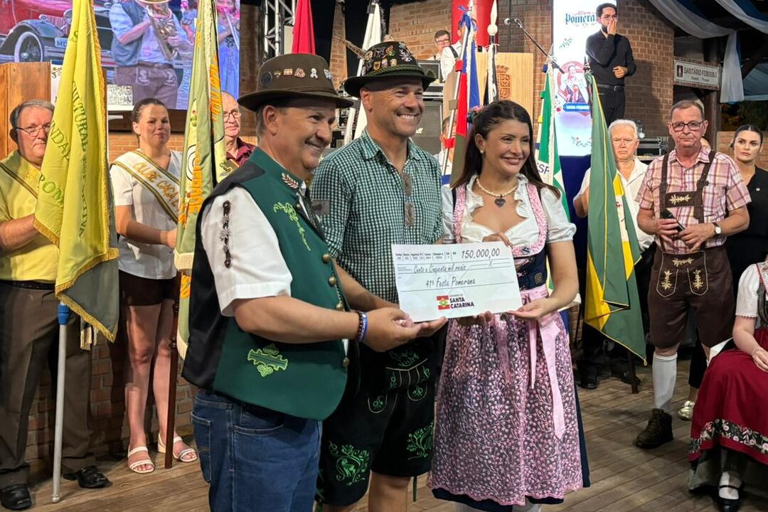 O Governo de SC também repassou à festa o valor de R$ 150.000,00, entregues ao prefeito Rafael Ramthun, pelas mãos do governador e da secretária de Estado do Turismo, Catiane Seif.