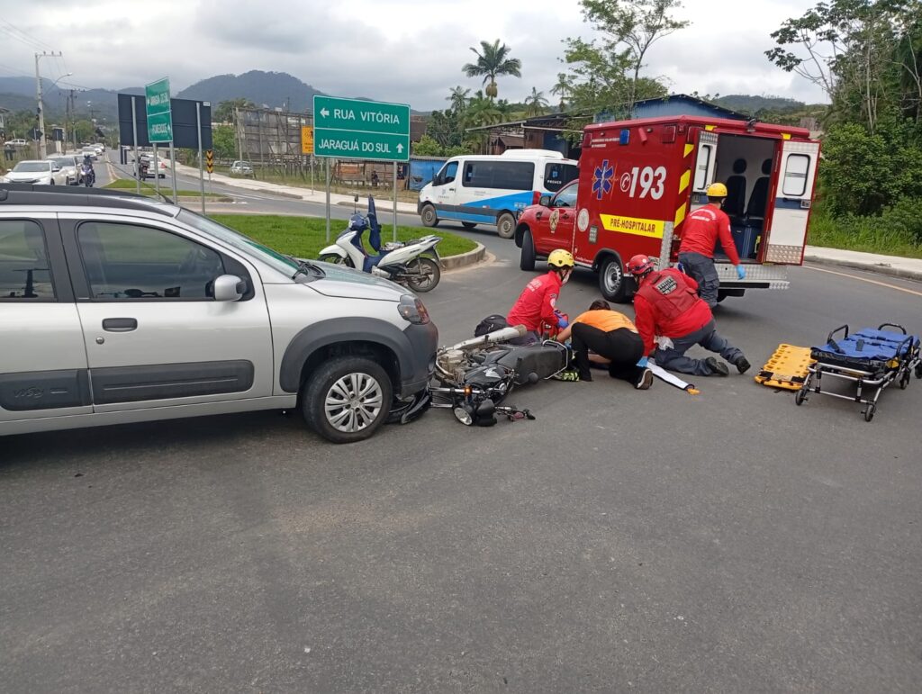 O motociclista, de 21 anos, foi atendido pelo Corpo de Bombeiros Voluntários de Pomerode e encaminhado ao HMRT, relatando dores na região da pelve e do tórax, no lado esquerdo.