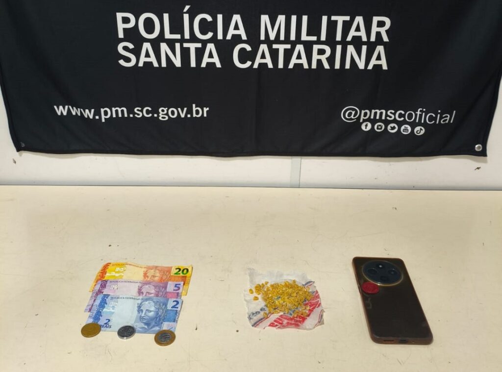 Foram encontrados com o adolescente, de 15 anos: 10g de crack, um aparelho celular e R$ 28,75 em espécie.
