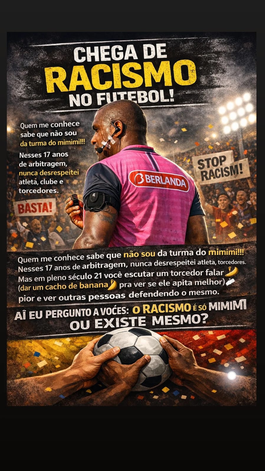 “Na hora, é uma mistura de sentimentos, raiva, indignação, revolta. Mas, pela nossa postura, temos que deixar esses sentimentos de lado e agir com a razão. Temos todas as orientações dentro do âmbito do futebol para essa situação, como os protocolos do racismo, que devem ser seguidos, tanto para jogos profissionais, quanto para amadores. Na hora, eu fiz a melhor coisa que deveria ser feita, que foi ter acionado o policiamento e identificado o autor”, relata o árbitro.