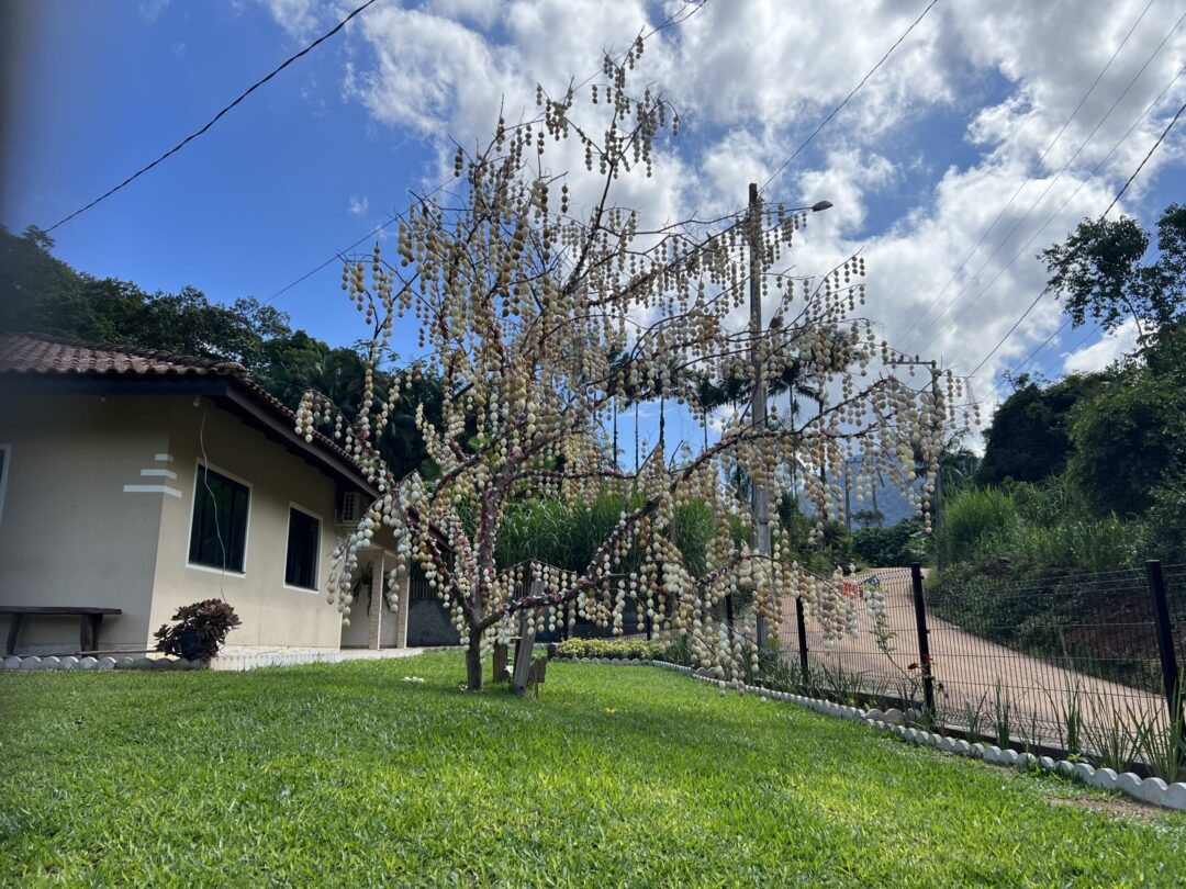 “No ano passado, eu fui na casa da minha sogra e conversamos sobre enfeitar com palha de milho as casquinhas naturais. Logo no início do ano, resolvi fazer o laço de palha, que não iria prejudicar a natureza e não geraria lixo. Inclusive já tenho guardado a palha para montar a árvore ainda maior em 2027”, conta Silmara Carvalho.