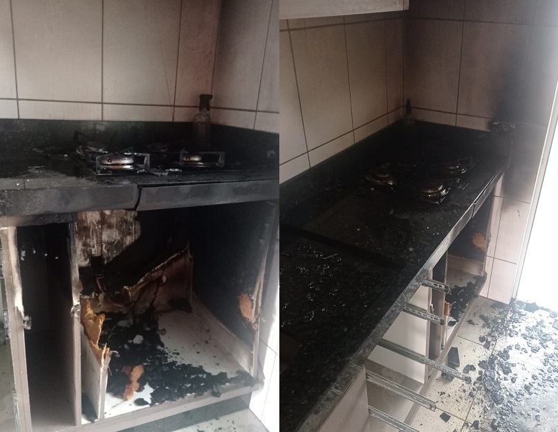 O foco das chamas foi identificado na cozinha de uma das residências, em um fogão, com o incêndio já em fase de desenvolvimento.