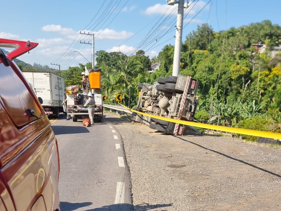 No local, constatou-se tratar de tombamento e colisão contra poste, de um caminhão caçamba.