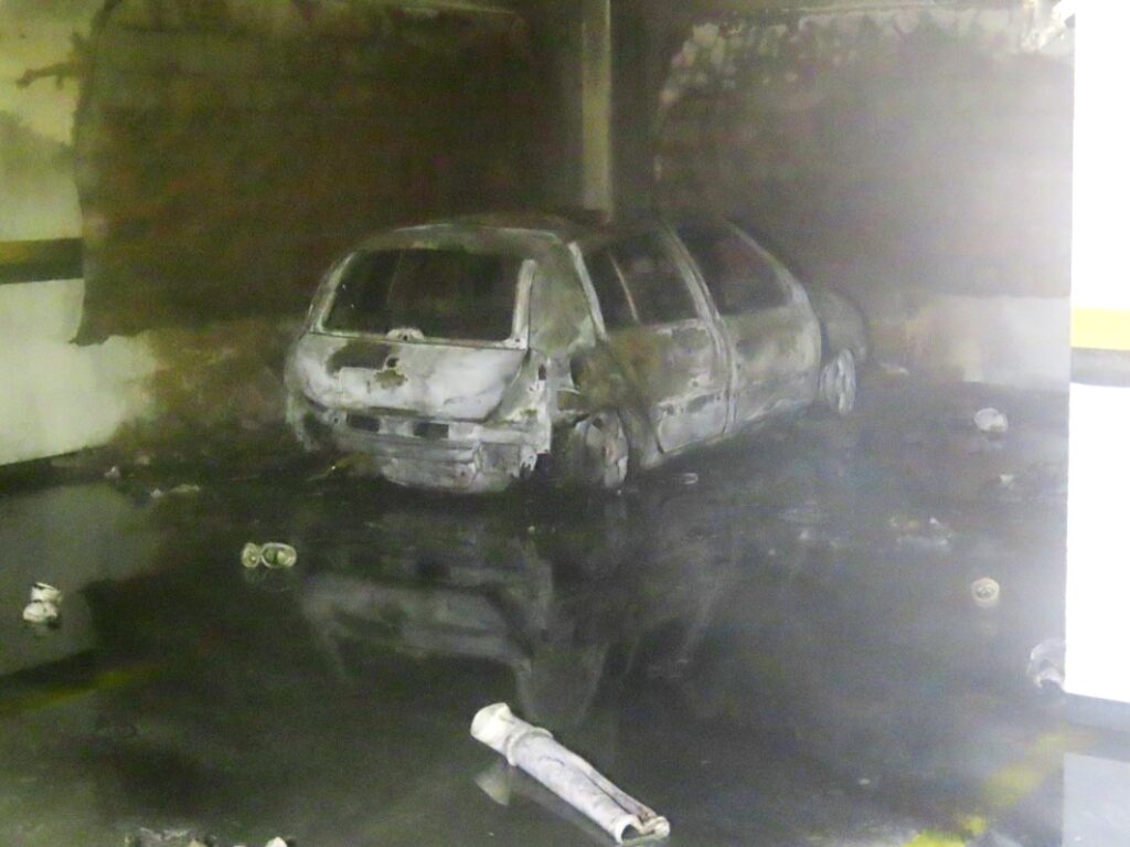 Um veículo de passeio, estacionado na garagem de um condomínio residencial, foi consumido pelas chamas, que também causaram danos às paredes e teto da garagem.