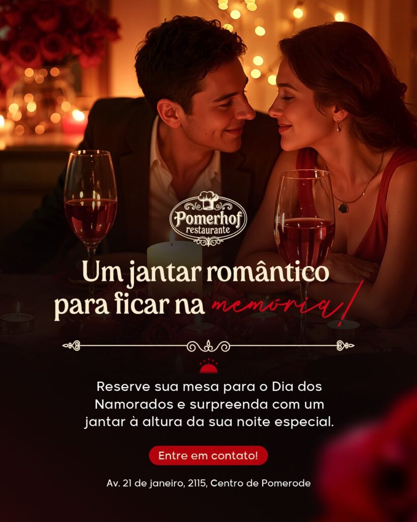 O Pomerhof Restaurante divulgou o cardápio especial para a noite do Dia dos Namorados. O menu inclui entrada, prato principal com opções variadas e sobremesa compartilhada.