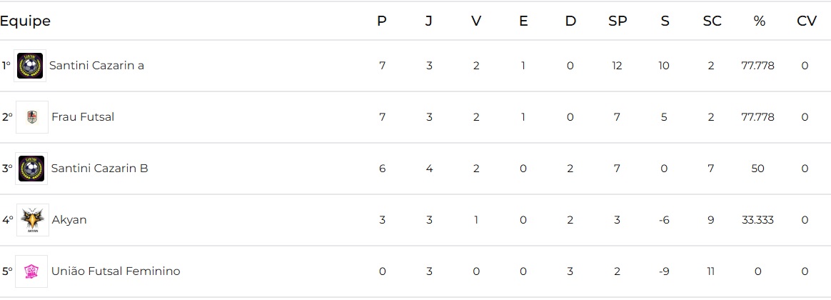 Cinco equipes fazem parte da competição comunitária: Akyan, Frau Futsal, Santini Cazarin A, Santini Cazarin B e União Futsal Feminino.