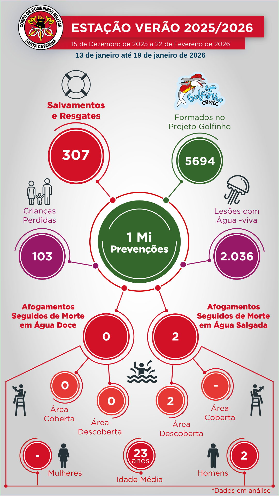 De acordo com os números da Operação Estação Verão, do dia 15 de dezembro até o dia 18 de janeiro, foram 1.289 arrastamentos por corrente de retorno, além de 42 afogamentos com recuperação em praias, totalizando 1.331 salvamentos.