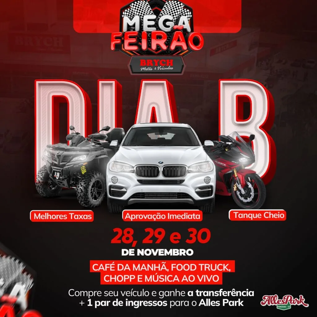 A Brych Veículos realiza, nos dias 28, 29 e 30 de novembro, o Mega Feirão Dia B, com Black Friday. O evento promete atrair o público com diversas atrações e condições especiais para quem busca adquirir veículos.