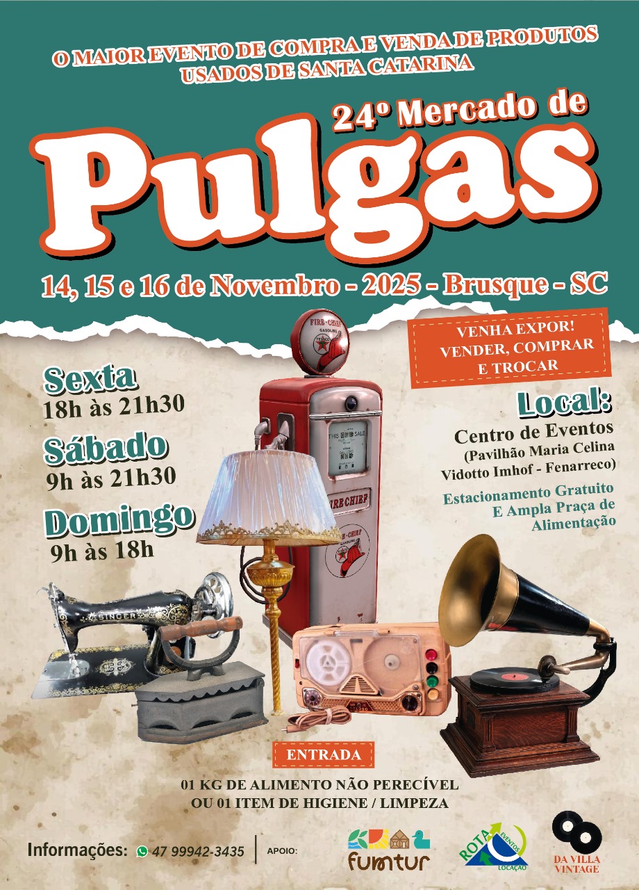 O 24º Mercado de Pulgas de Brusque tem o apoio da Fundação Municipal de Turismo, Rota Eventos e Villa Vintage.