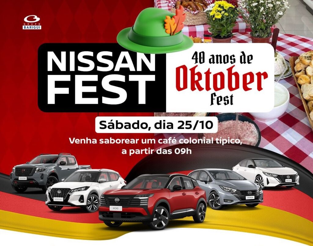 Neste sábado, dia 25 de outubro, a Nissan Barigüi Blumenau convida você para uma manhã especial em comemoração aos 40 anos da Oktoberfest. A partir das 9h, venha saborear um café colonial típico, repleto de sabores tradicionais que homenageiam a cultura germânica da nossa região.