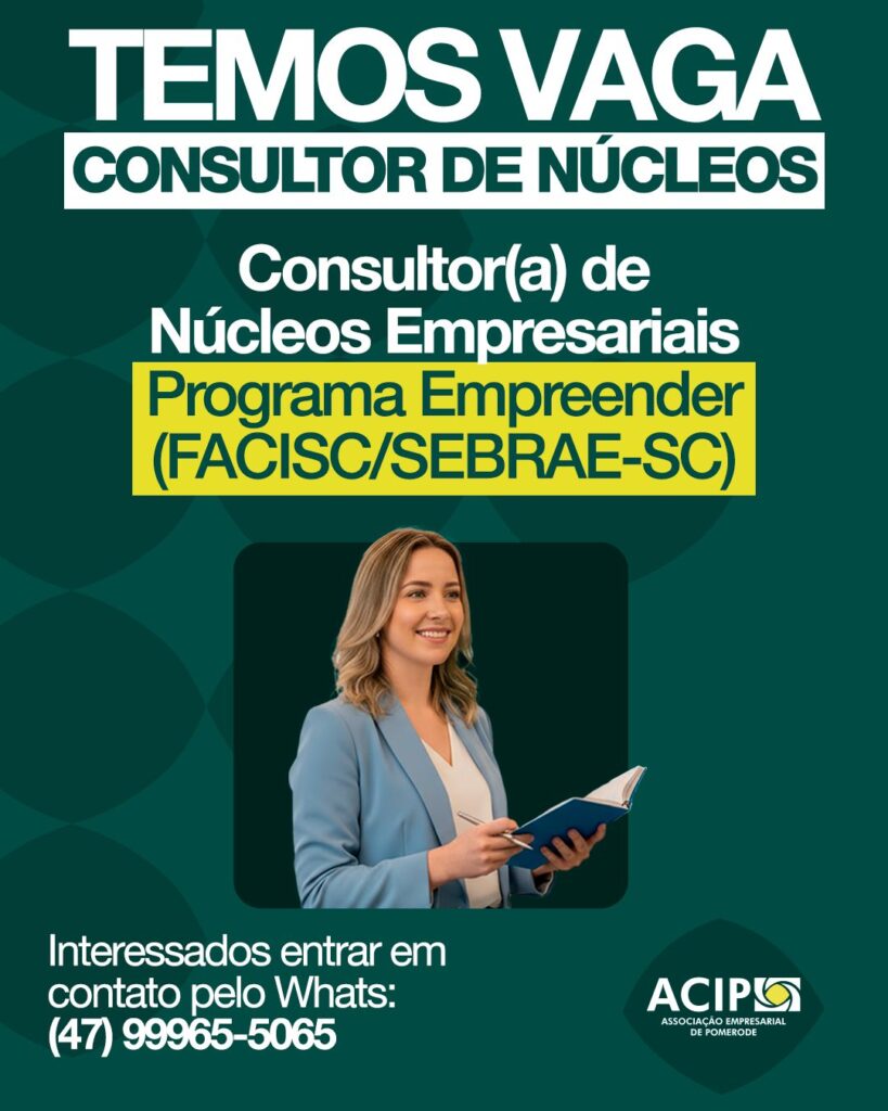 A Associação Empresarial de Pomerode (ACIP) abriu processo seletivo para a contratação de um(a) Consultor(a) de Núcleos Empresariais. A oportunidade é voltada a profissionais interessados em atuar diretamente no fortalecimento do associativismo local, por meio do Programa Empreender, desenvolvido em parceria com a FACISC e o SEBRAE-SC.