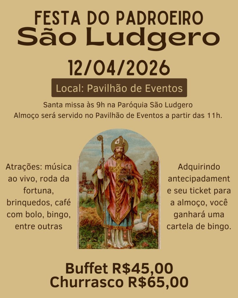 A comunidade de São Ludgero já está em contagem regressiva para a celebração de seu padroeiro. No próximo dia 12 de abril, uma programação especial promete reunir fiéis e famílias para um dia de espiritualidade e confraternização.