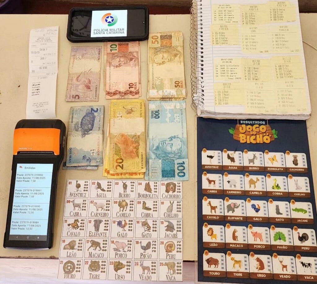 No local, a guarnição já percebeu, em cima de uma mesa, um caderno de anotações do “Jogo do Bicho” e duas placas de divulgação, além de um papel impresso de jogo realizado.