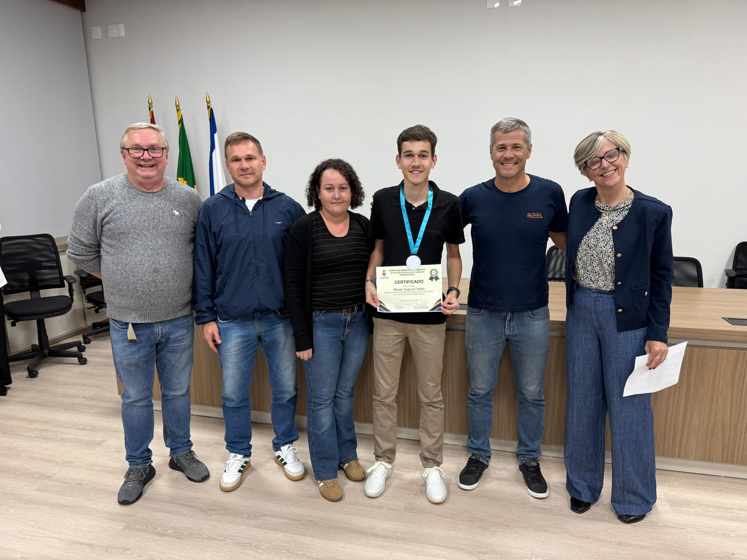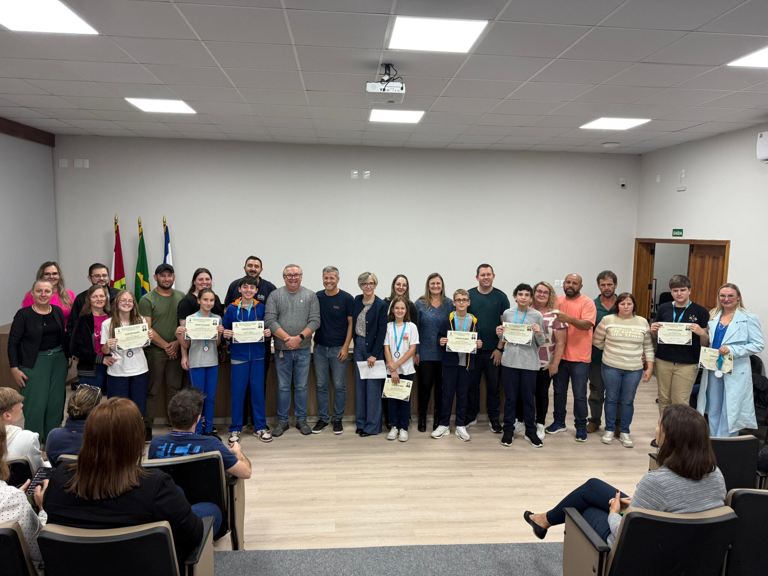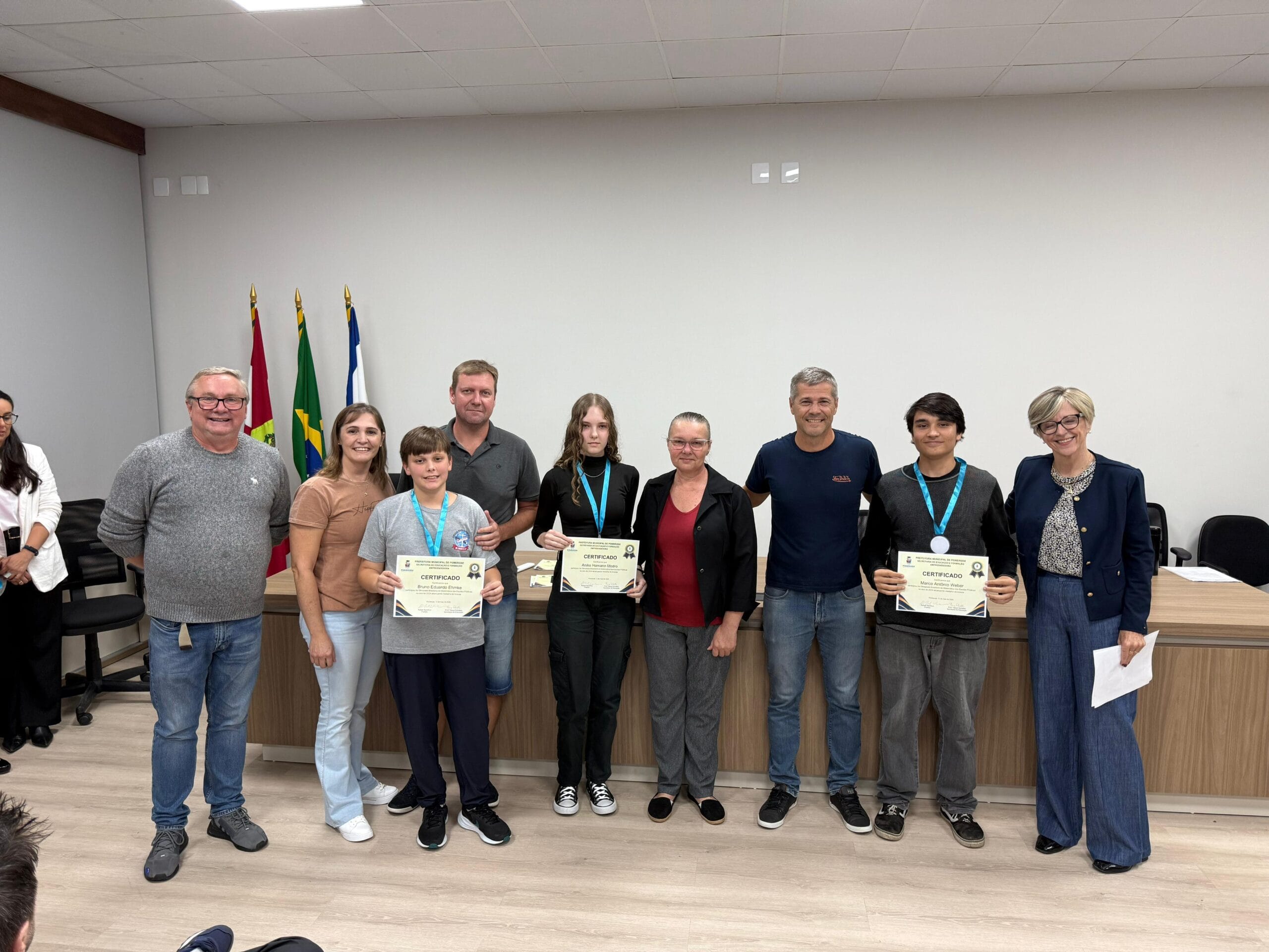 A Prefeitura de Pomerode realizou, na tarde de terça-feira (13/05), a cerimônia de premiação dos estudantes que se destacaram na edição de 2024 da Olimpíada Brasileira de Matemática das Escolas Públicas (OBMEP). O evento ocorreu no auditório da Prefeitura e contou com a presença de alunos, professores, gestores escolares e autoridades locais.