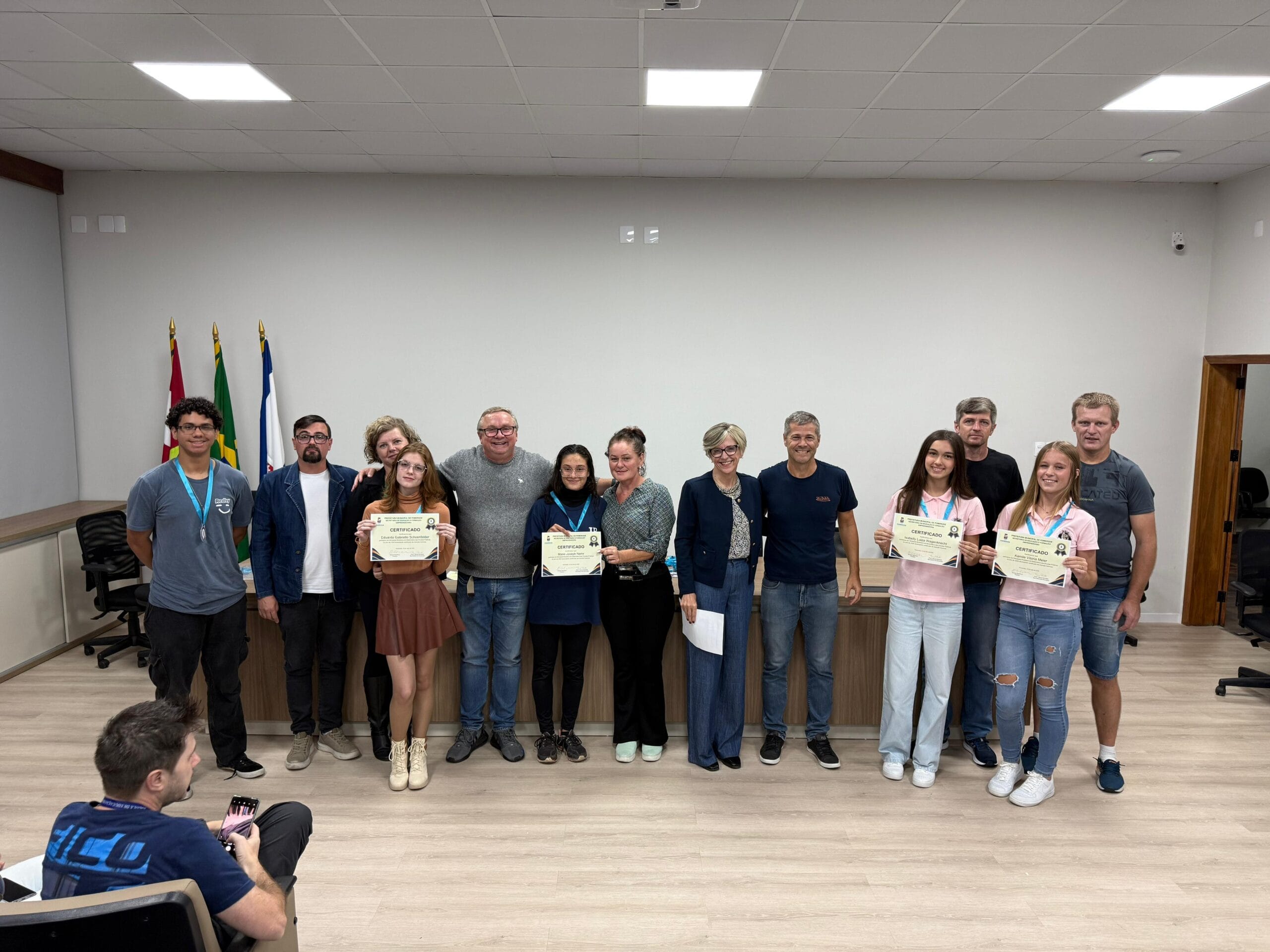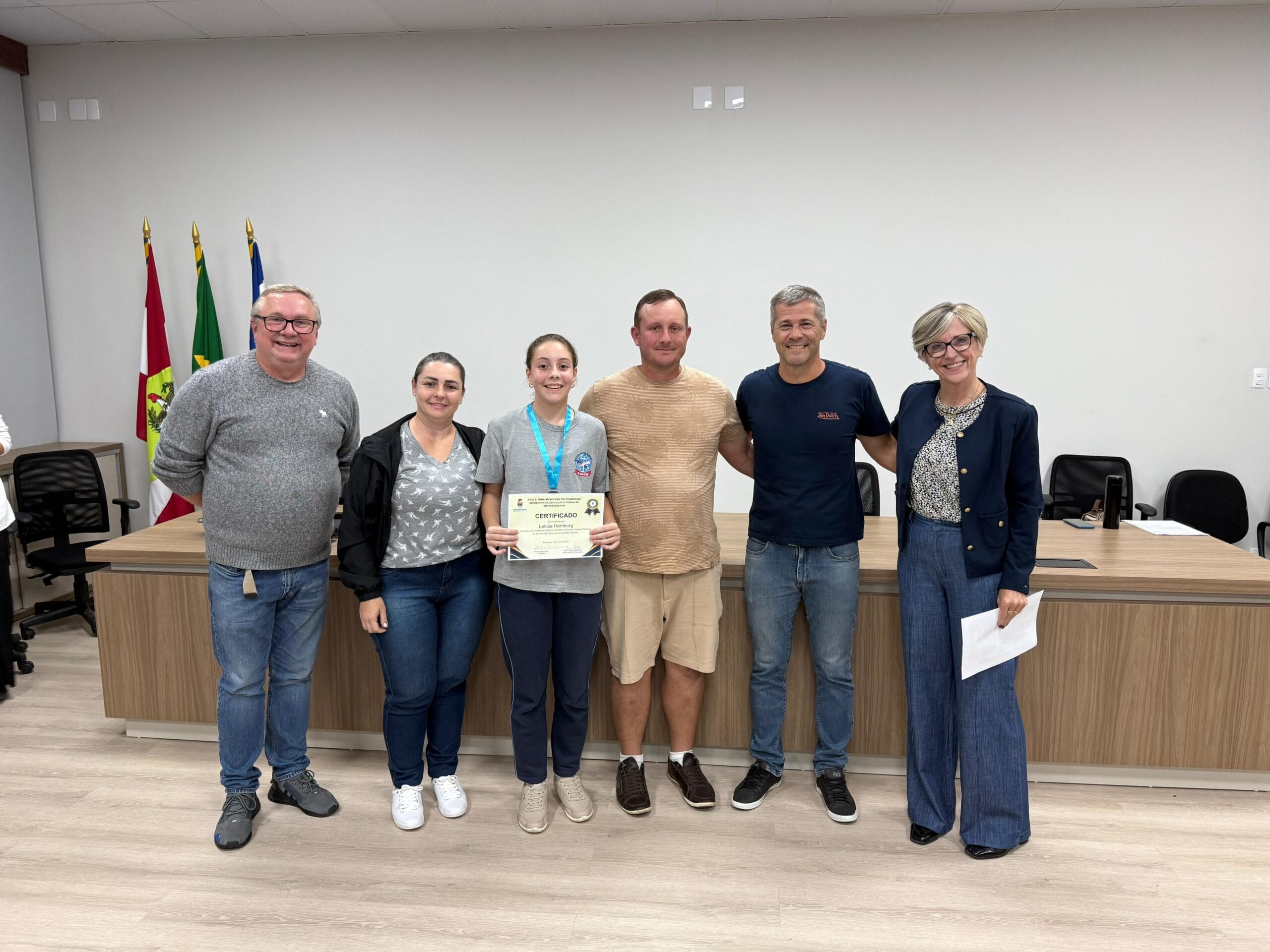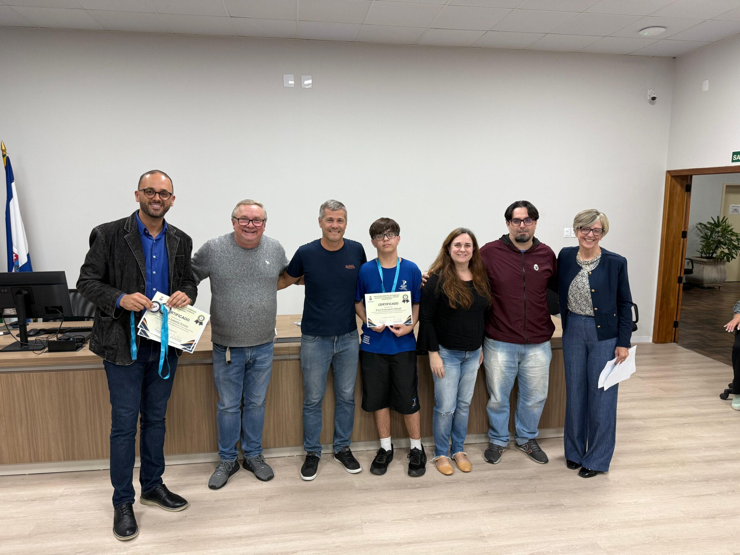 A Prefeitura de Pomerode realizou, na tarde de terça-feira (13/05), a cerimônia de premiação dos estudantes que se destacaram na edição de 2024 da Olimpíada Brasileira de Matemática das Escolas Públicas (OBMEP). O evento ocorreu no auditório da Prefeitura e contou com a presença de alunos, professores, gestores escolares e autoridades locais.