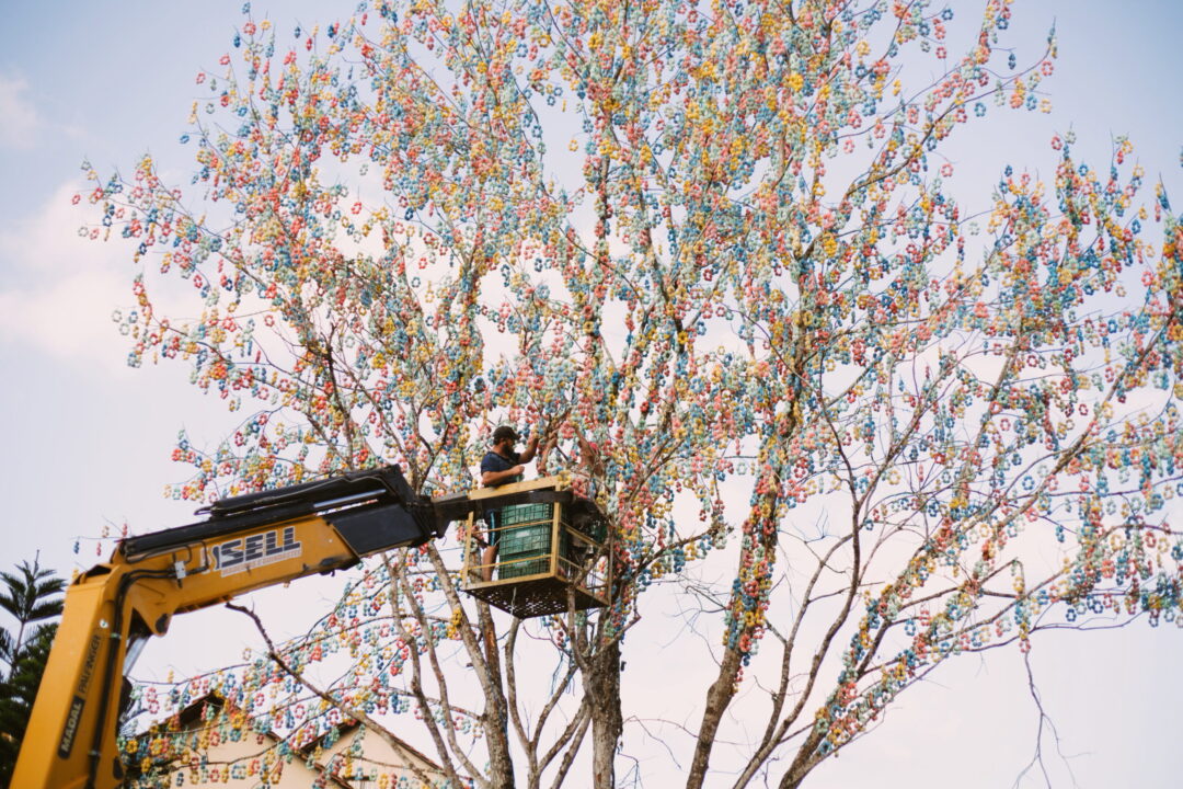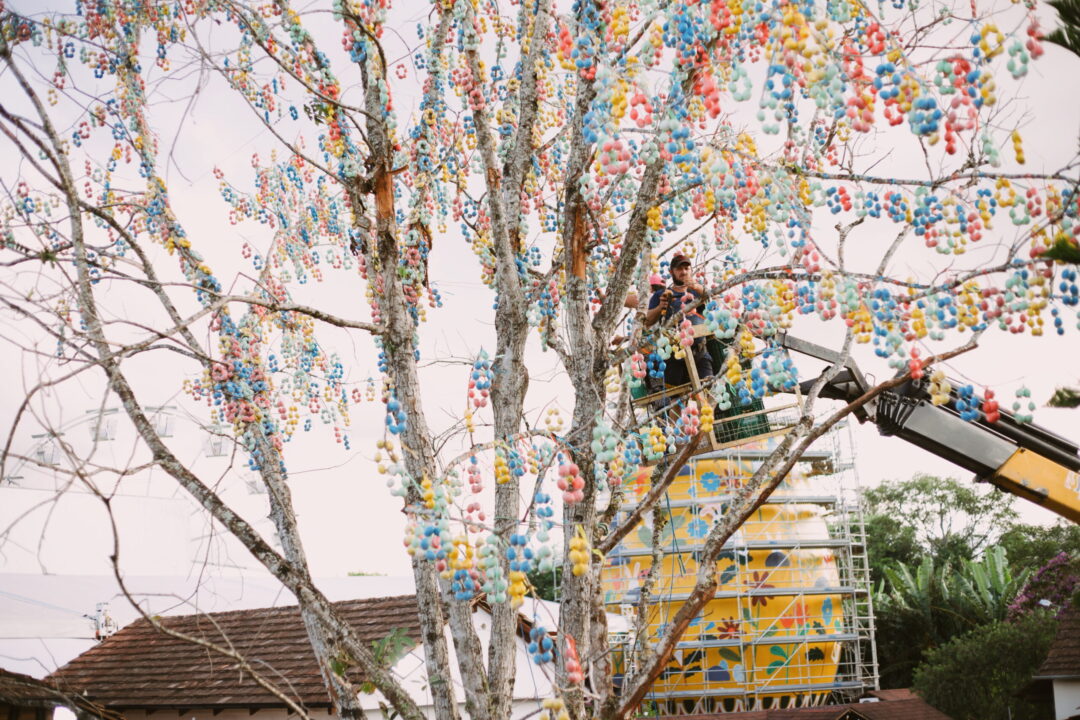 Mais de 105 mil casquinhas coloridas estão sendo penduradas com a ajuda de um guindaste, representando a antiga tradição praticada pelas famílias cristãs de Pomerode.