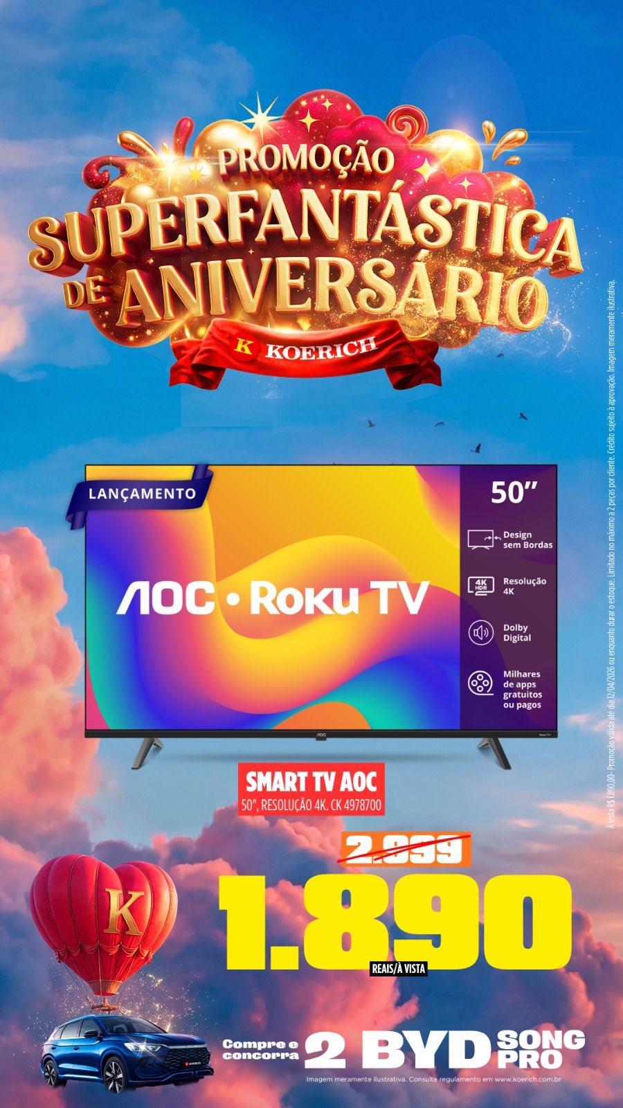 Smart TV AOC 50″ 4K com sistema Roku TV e som Dolby Digital por apenas R$ 1.890 à vista.