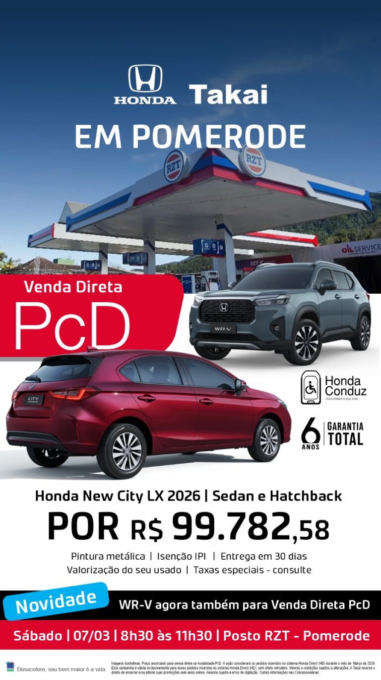 Entre os destaques está o Honda City LX, disponível nas versões Sedan e Hatch, com pintura metálica e condições especiais. Já para quem possui direito aos benefícios fiscais, também haverá orientação sobre a modalidade de venda direta PcD, com isenção de impostos.