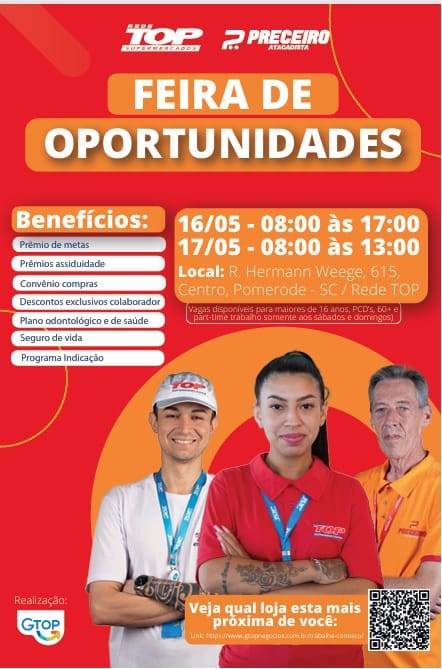 Adicionalmente, a Rede Top informa que o recebimento de currículos e o processo seletivo ocorrerão diariamente na loja para aqueles que não puderem comparecer ao feirão.