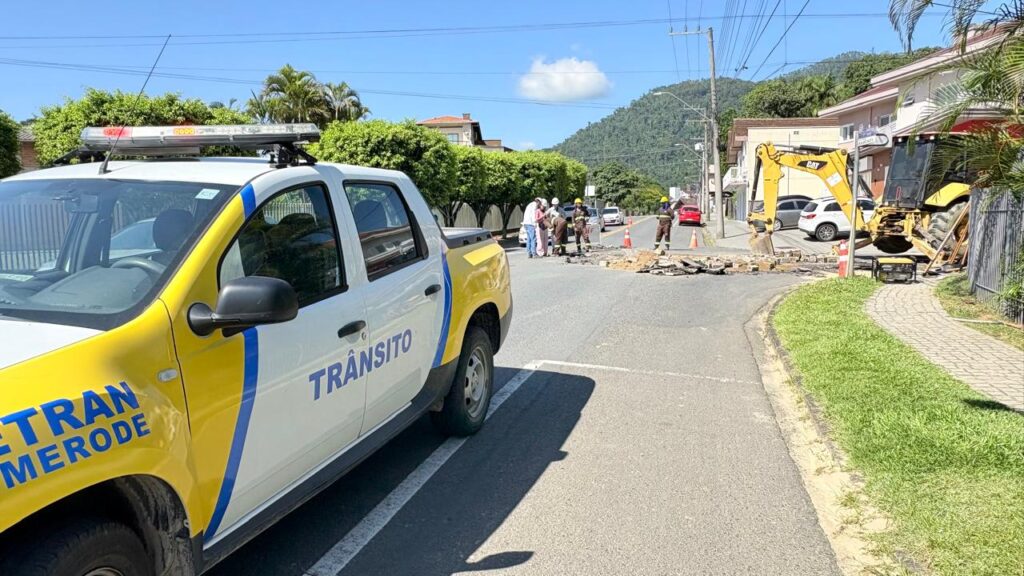 Nesta sexta-feira, 13 de fevereiro, um rompimento na rede, no cruzamento da Rua Dr. Blumenau com a Rua Luiz Abry, está afetando o abastecimento de água em algumas ruas de Pomerode.