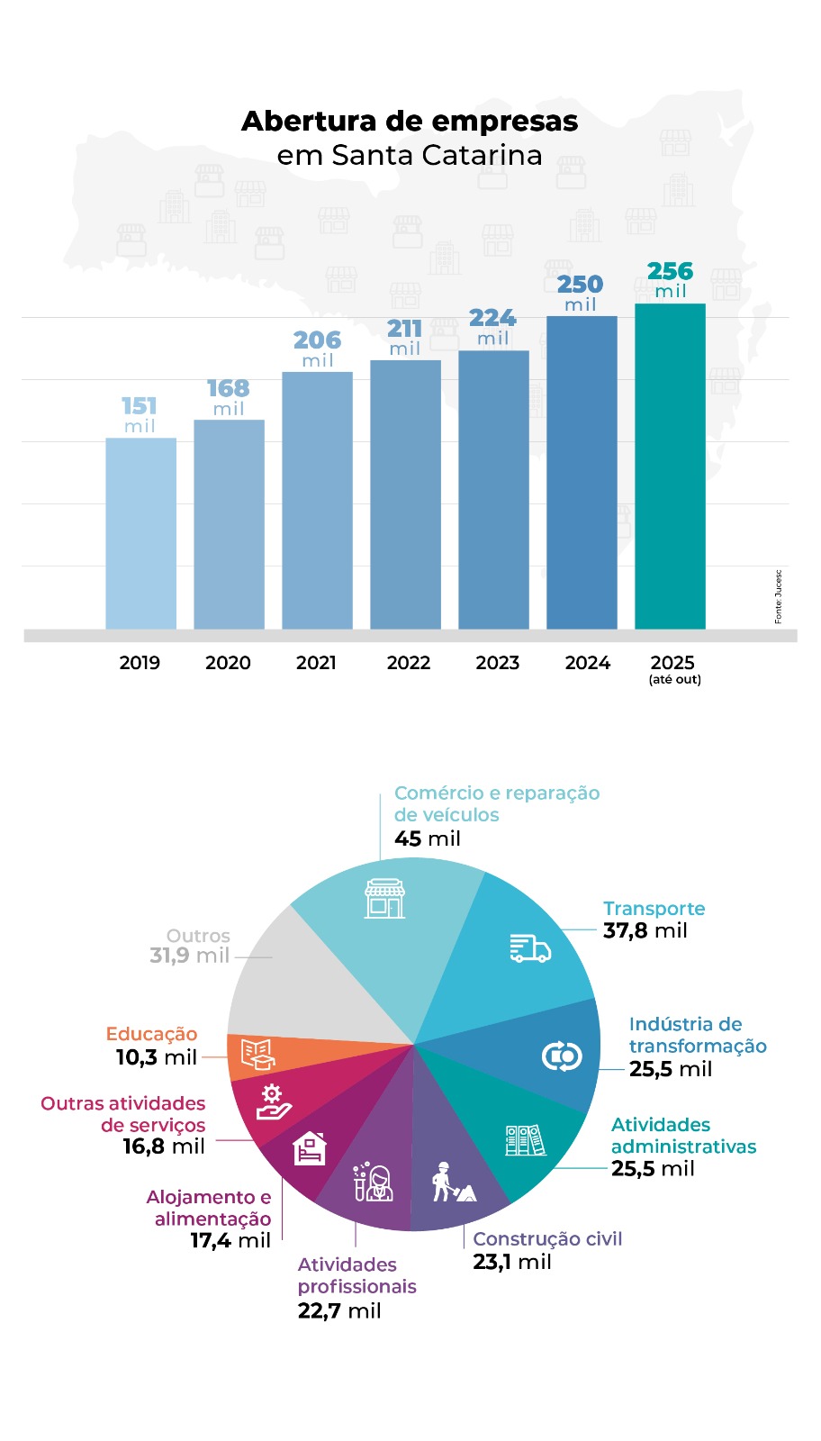 De acordo com dados da Jucesc, o segmento de comércio e reparação de veículos é o que mais abriu empresas em 2025, com 45 mil novos CNPJs entre janeiro e outubro. Na vice-liderança aparece o setor de transporte, com 37,8 mil empresas criadas.