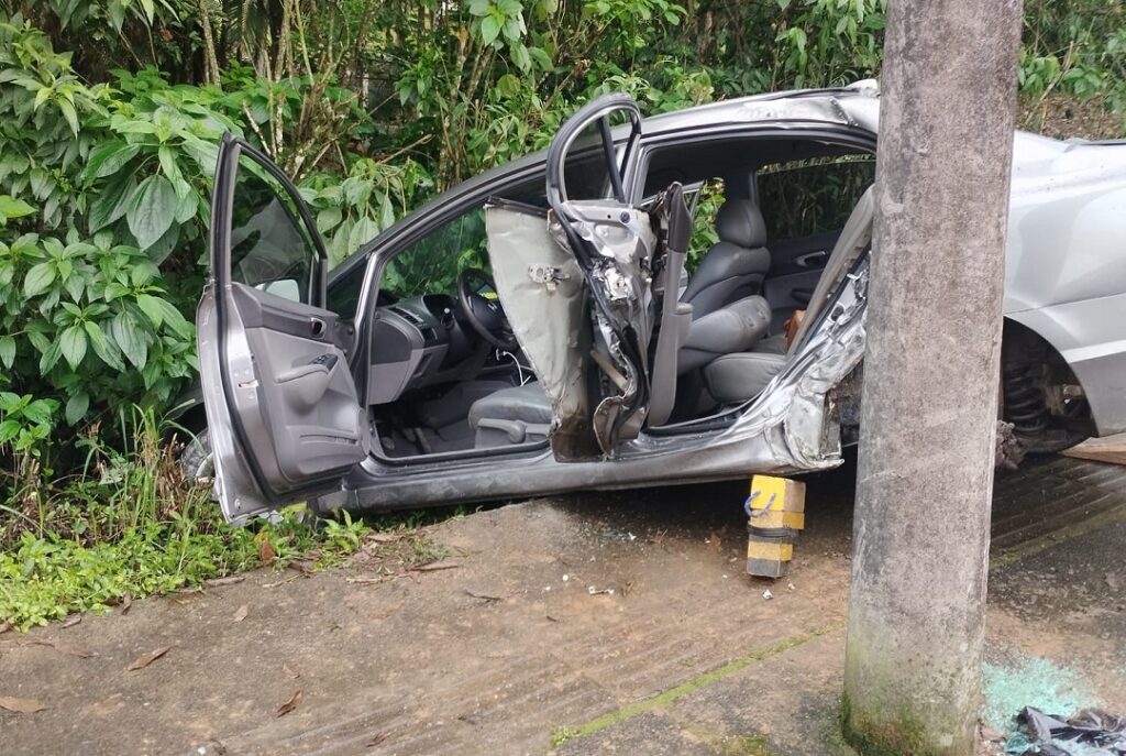 Ele estava consciente, mas apresentando confusão e não conseguia sair do automóvel, devido à significativa deformidade estrutural, causada pelo impacto contra o poste.