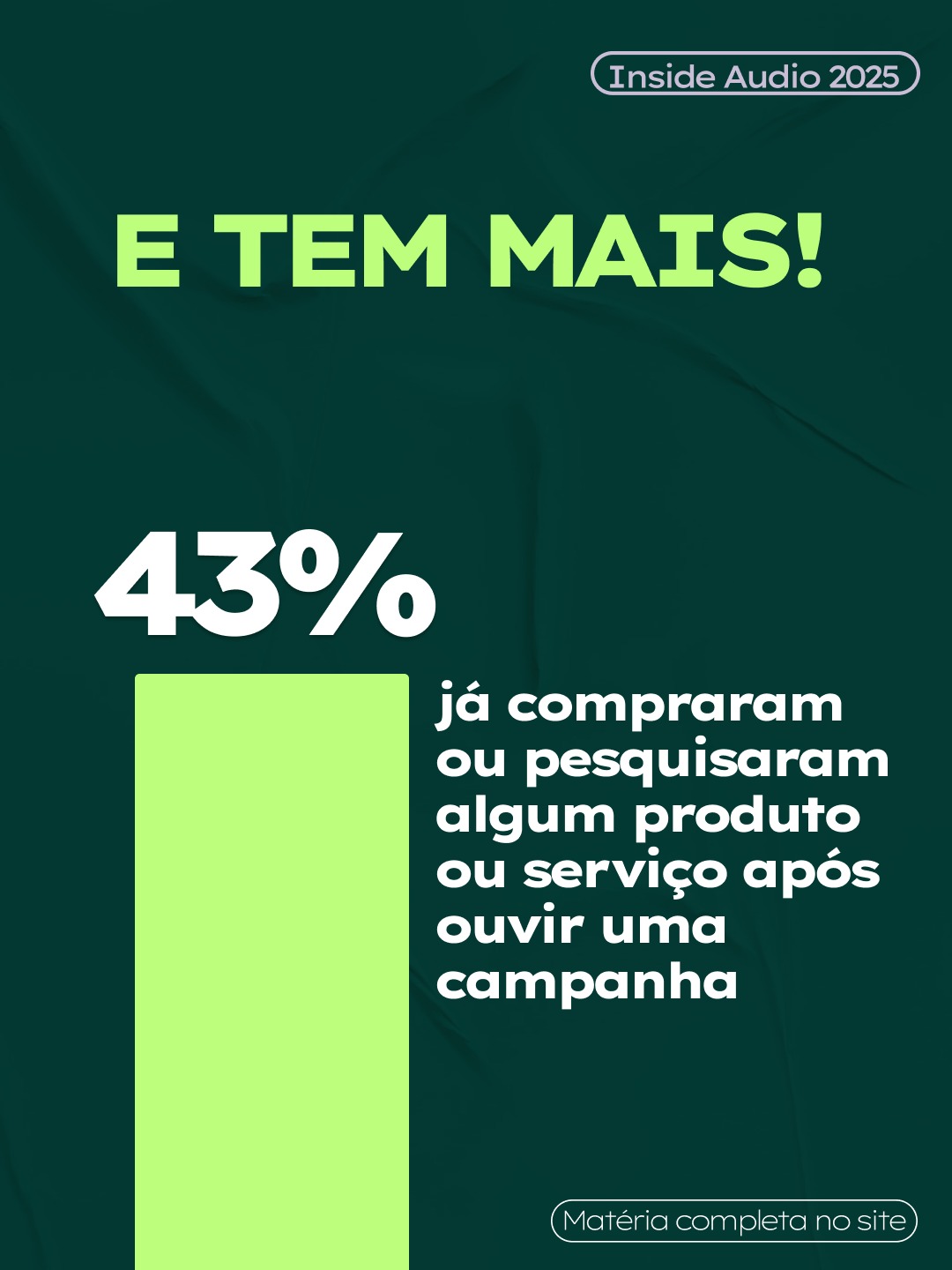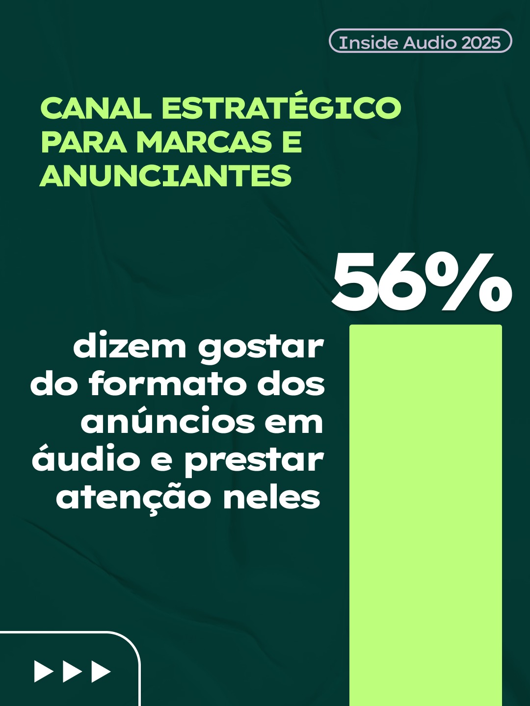 A publicidade em áudio acompanha esse movimento. Entre os ouvintes de rádio, 56% dizem gostar do formato dos anúncios em áudio e prestar atenção neles, enquanto 43% já compraram ou pesquisaram algum produto ou serviço após ouvir uma campanha sonora.