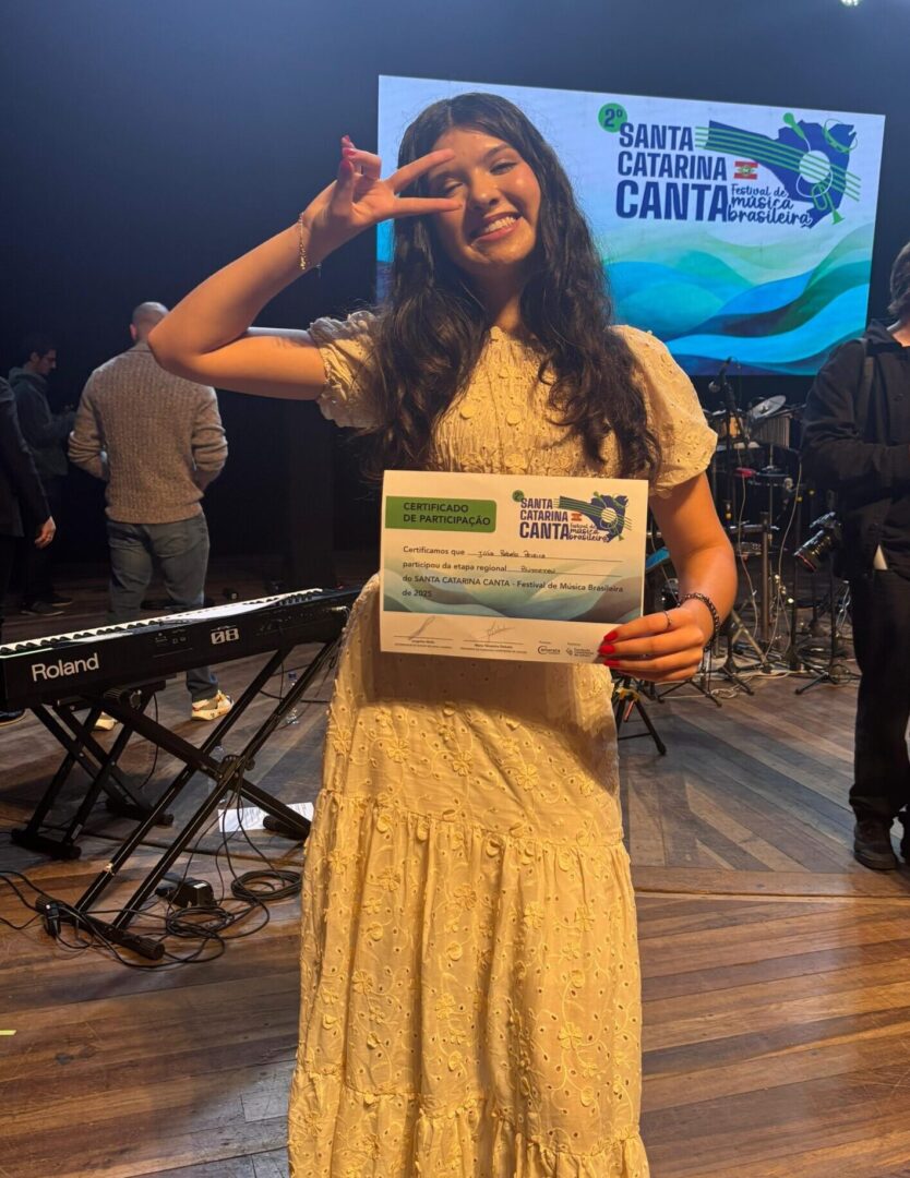“Eu sempre gostei de cantar, desde pequena. Por isso, comecei a cantar em festivais aos meus nove anos, em São Joaquim, cidade onde eu morava na época. E, desde lá, não parei mais de participar. Então, no ano passado, o Governo de Santa Catarina criou o ‘Santa Catarina Canta’ e eu resolvi me inscrever, só que eu acabei não passando para a semifinal. Mas eu não desisti. Busquei me aprimorar mais e, esse ano, tentei mais uma vez e consegui avançar, o que me deixou muito feliz”, relata a jovem.