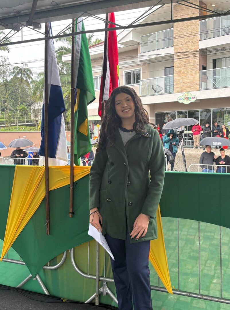 Quem esteve presente ao Desfile Cívico de 07 de setembro, pôde acompanhar o talento da jovem Júlia Rabelo Pereira. Do alto do palanque destinado às autoridades, a jovem de 15 anos cantou os hinos do Brasil, de Pomerode e da Independência, com maestria e muita segurança.