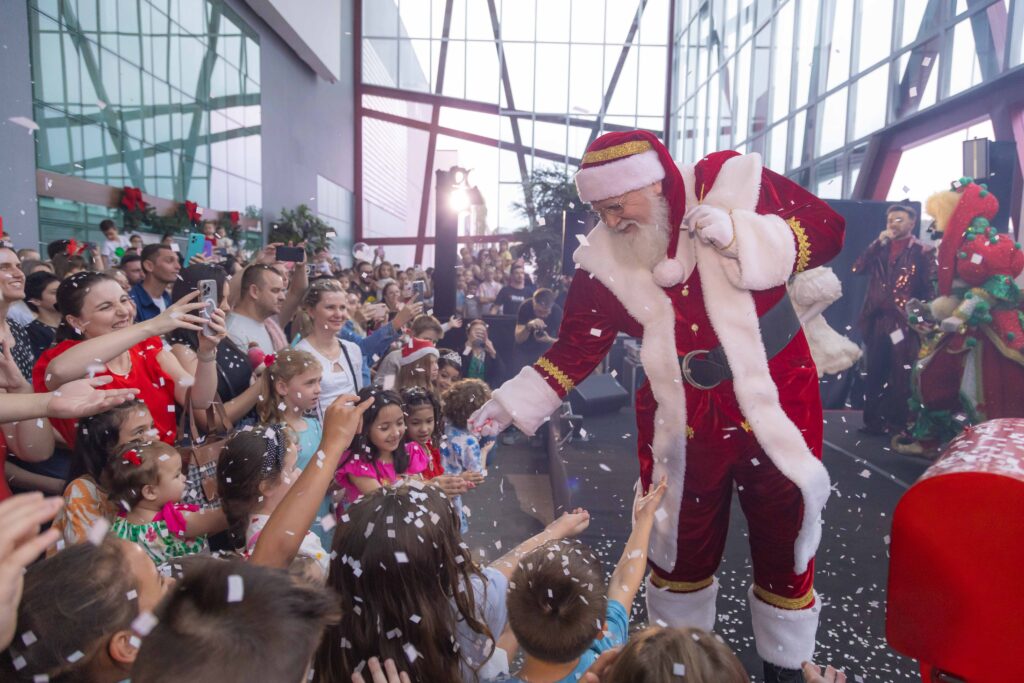A decoração transforma a praça central em um cenário imersivo e interativo, onde o Papai Noel e seus pets cantam canções natalinas.