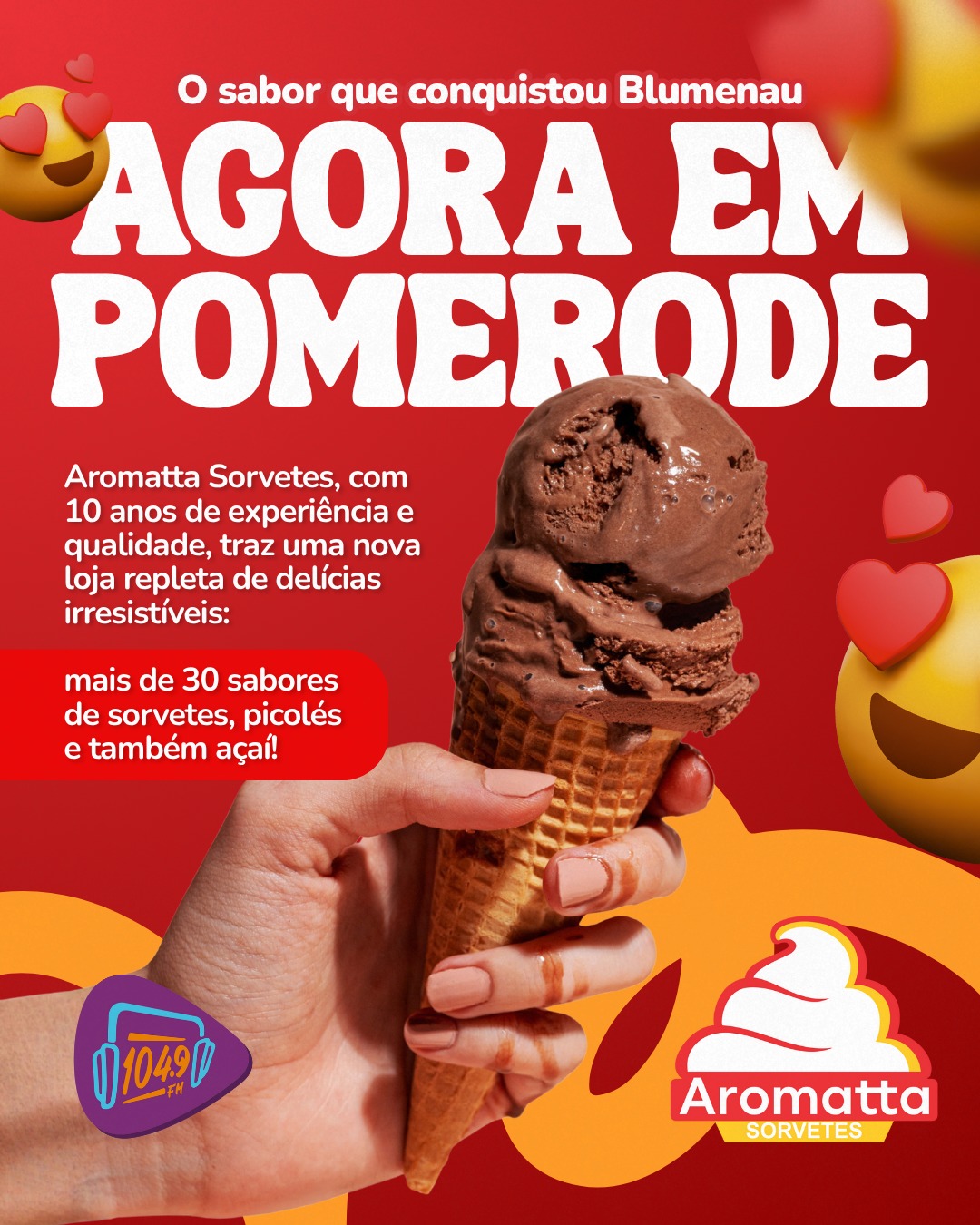 A cidade de Pomerode vai ganhar um novo ponto de encontro para quem ama sorvetes, picolés e açaí. Com 10 anos de tradição e qualidade reconhecida em Blumenau, a Aromata Sorvetes inaugura sua nova loja nesta sexta-feira, 22 de novembro, na Rua Hermann Weege, em frente ao hospital.